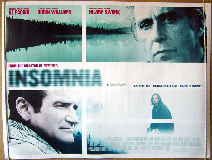 În primul rând, acest Insomnia este un remake al unui film norvegian cu același nume din 1997, regizat de Erik Skjoldbjærg. Deci din start avem o lipsă de originalitate, fiind direct un copy-paste movie, doar că Nolan al nostru a venit cu adaptarea lui, și nici la scenariu nu avem vreo iscălitură din partea lui Nolan, acesta fiind scris de Hillary Seitz.